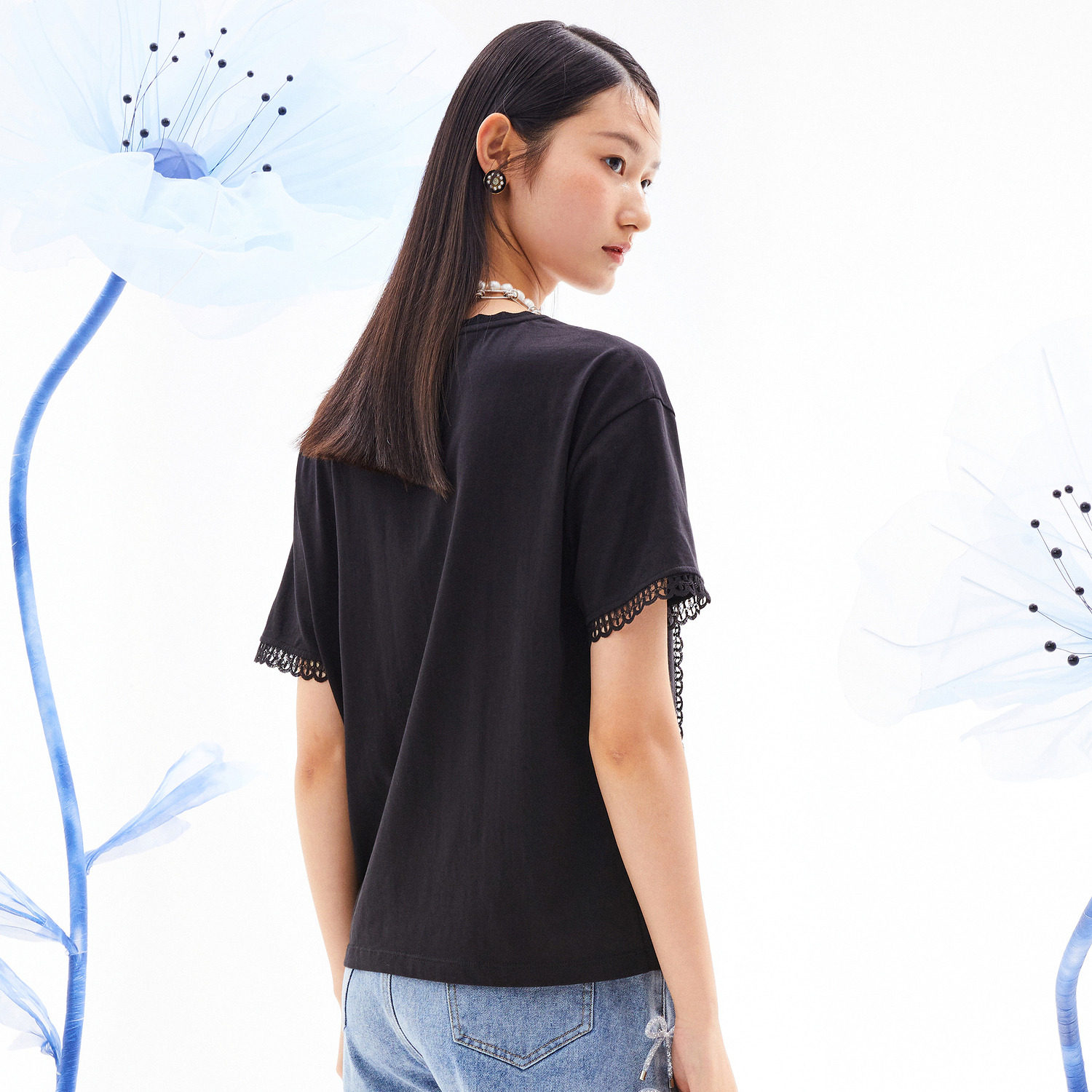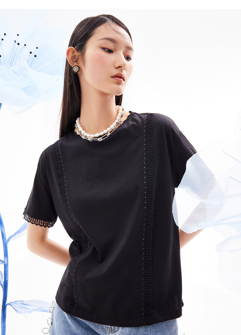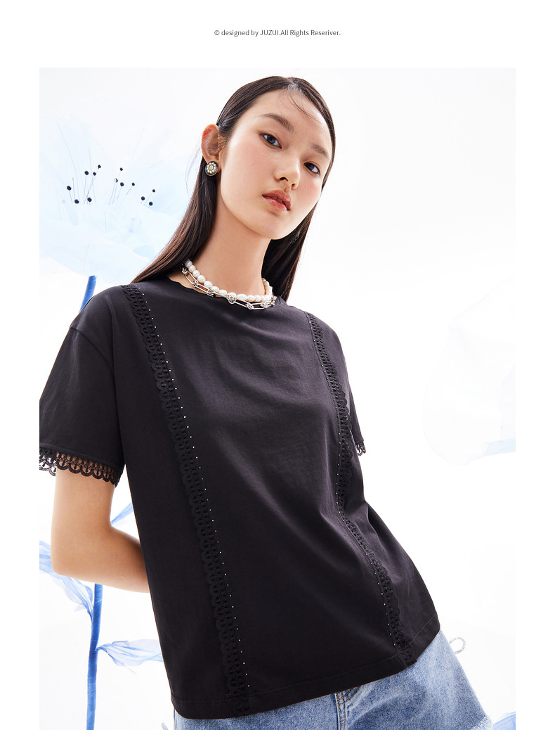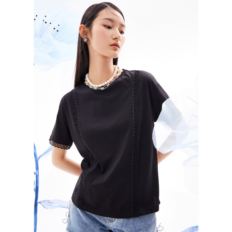 玖姿2021夏季新款安娜蔻系列黑色蕾丝拼接时尚烫钻休闲短袖女T恤