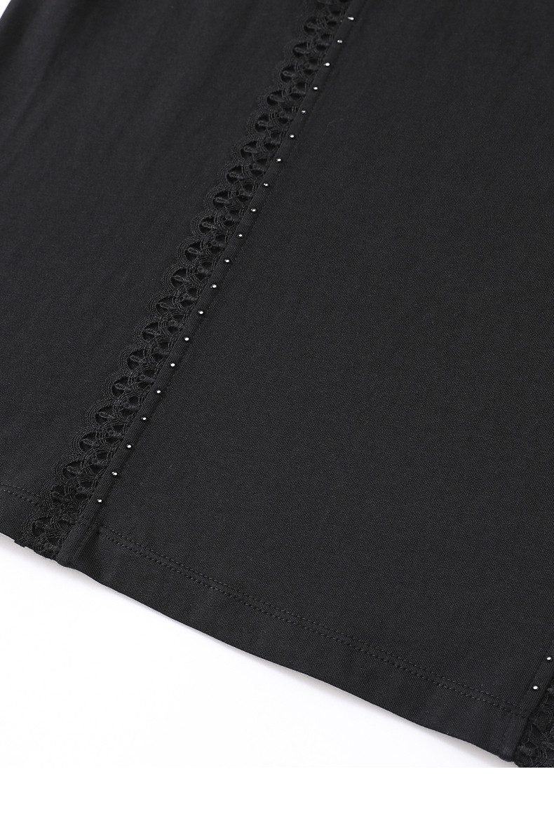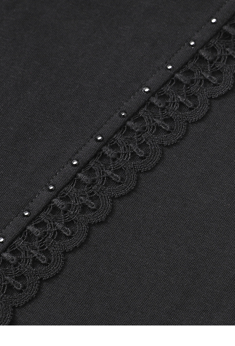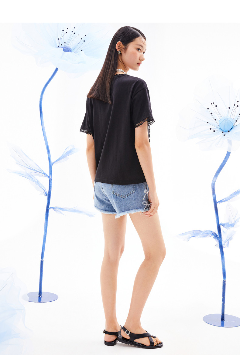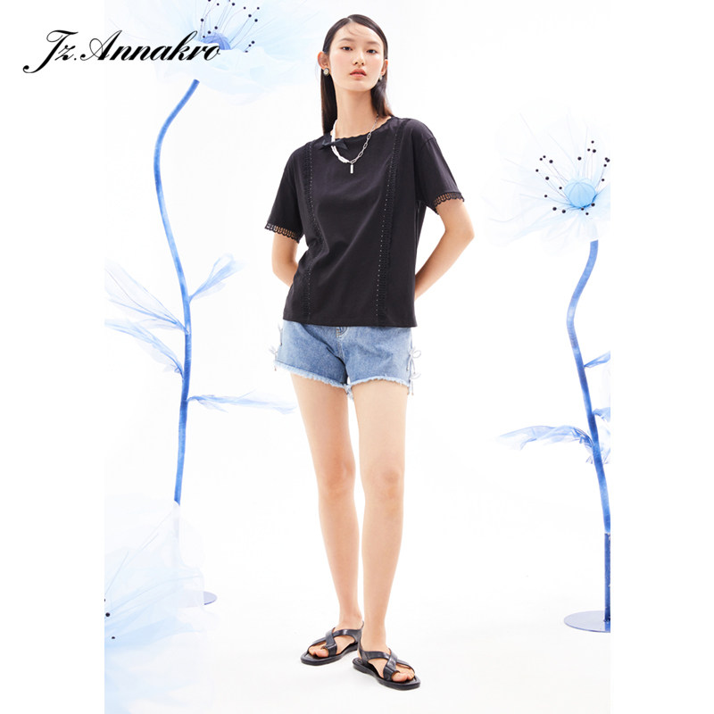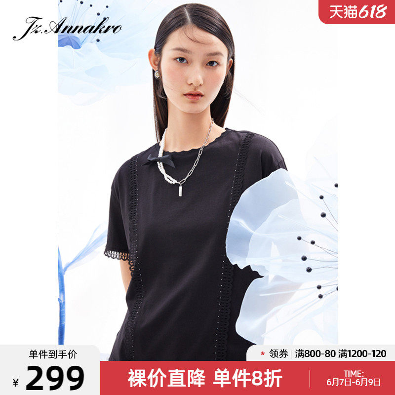 玖姿2021夏季新款安娜蔻系列黑色蕾丝拼接时尚烫钻休闲短袖女T恤