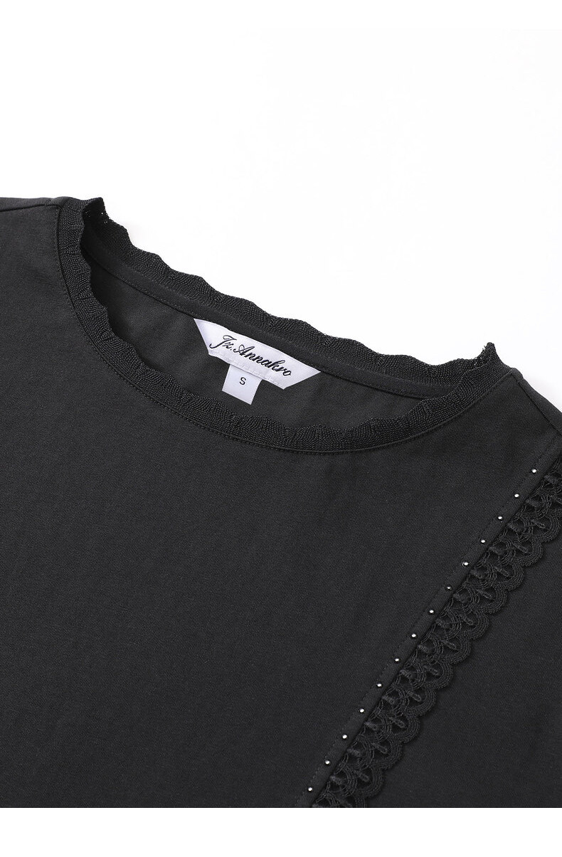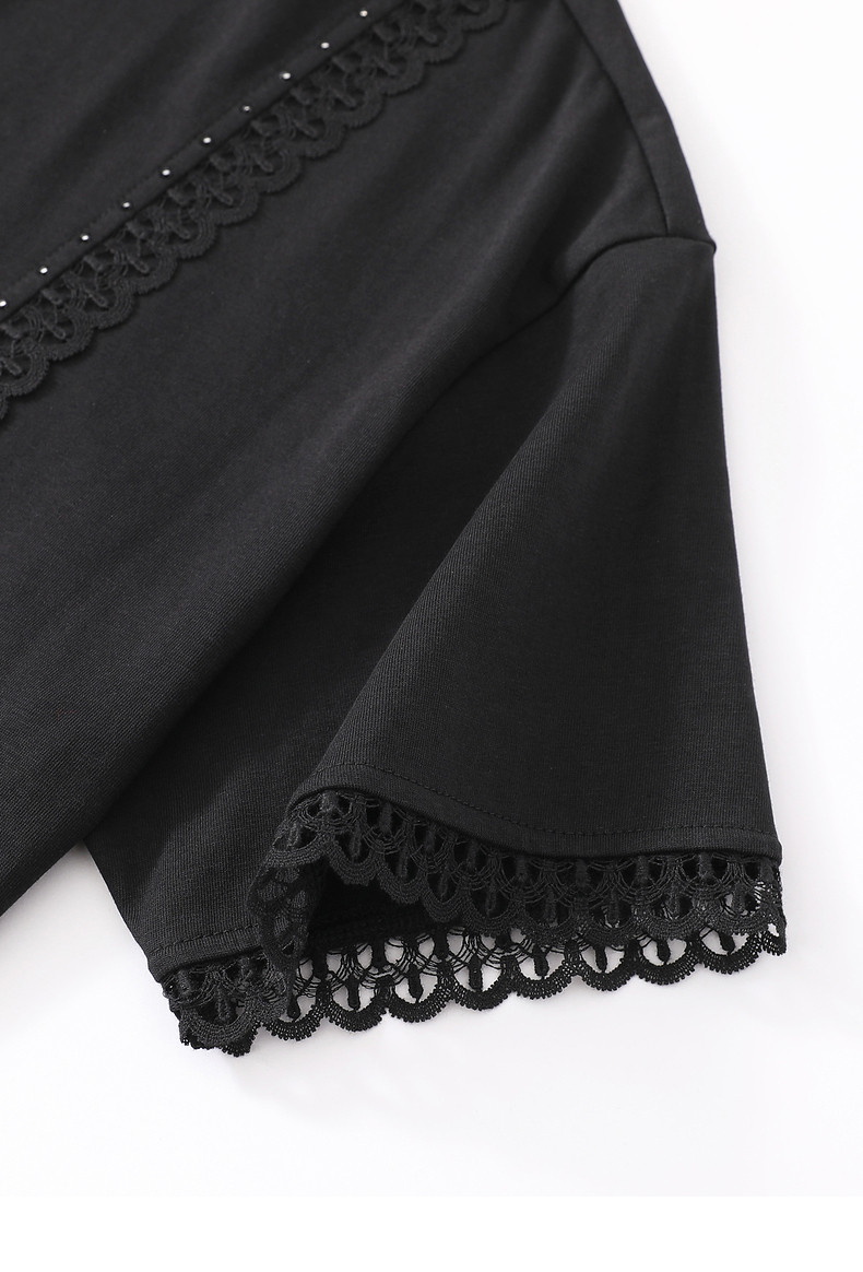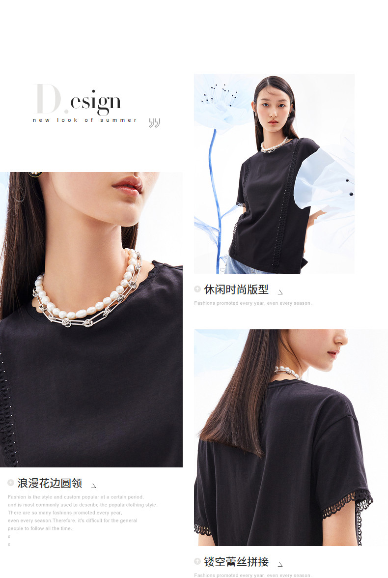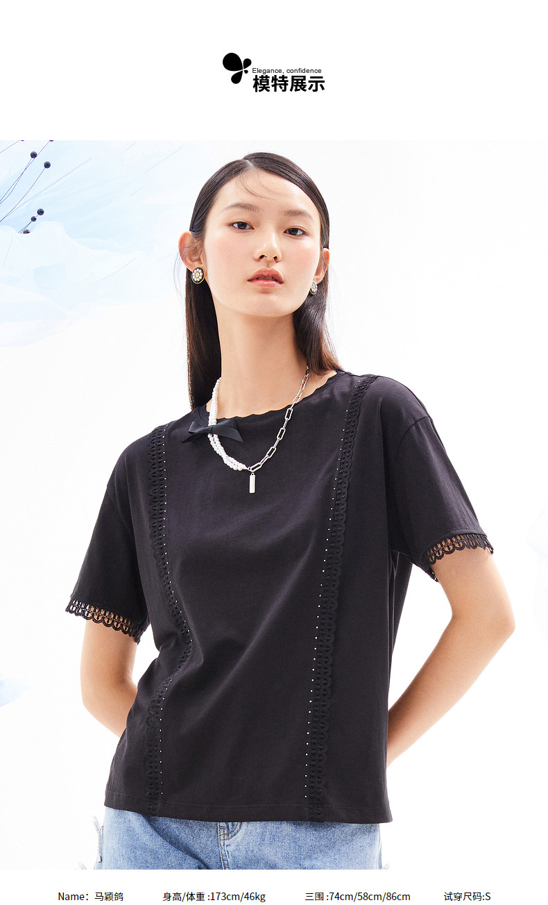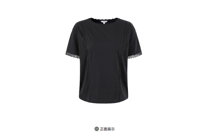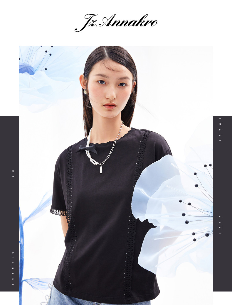 首页 > 玖姿专区 > 玖姿服饰 > 玖姿2021夏季新款安娜蔻系列黑色蕾丝拼接时尚烫钻休闲短袖女T恤