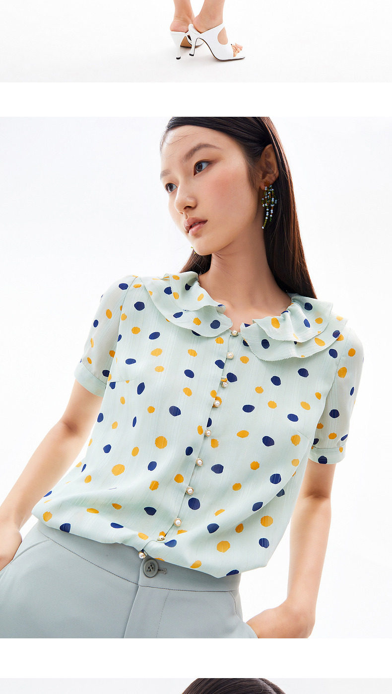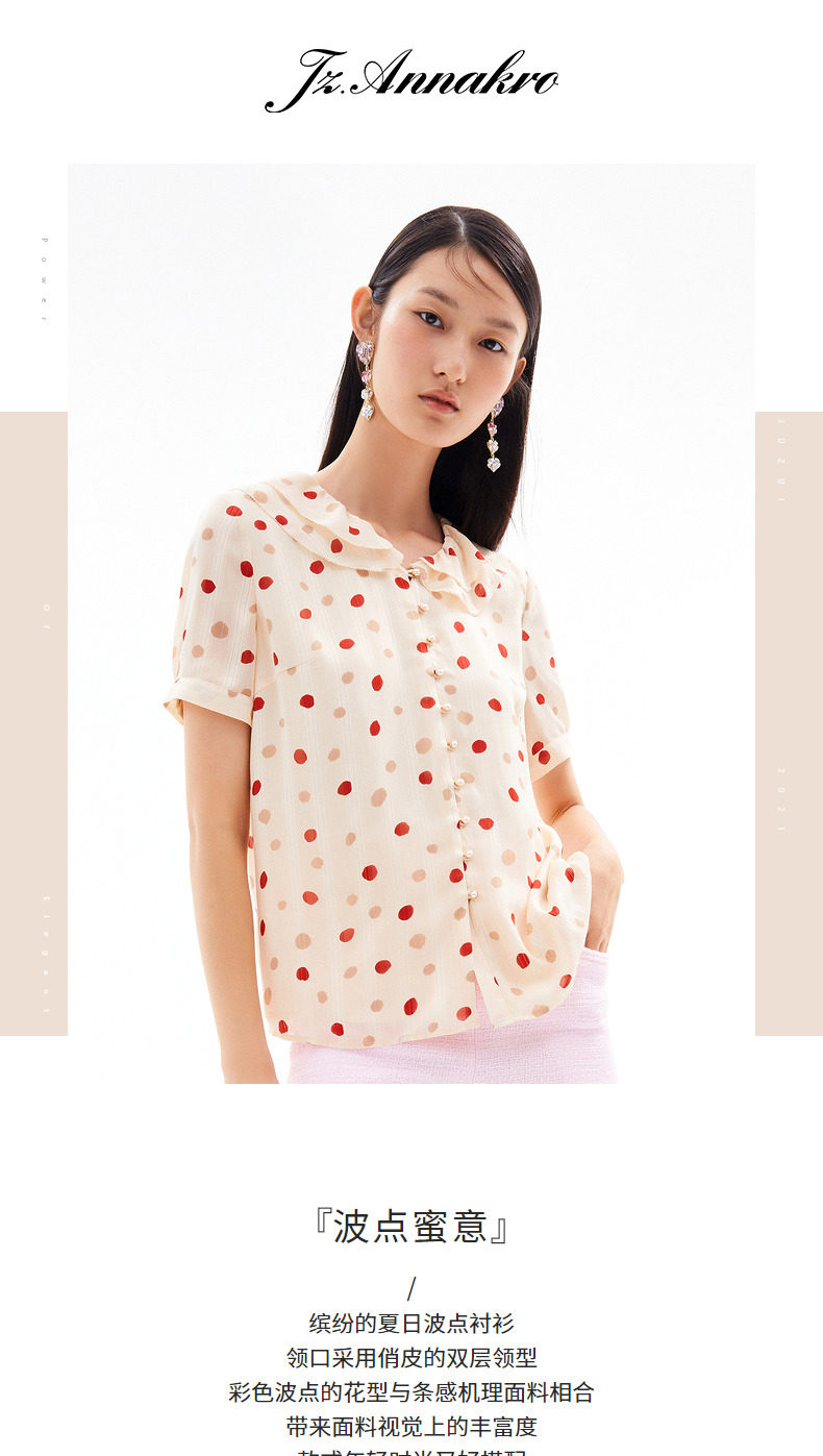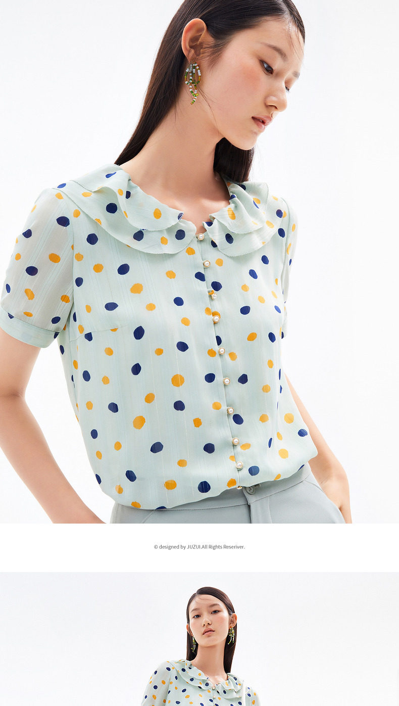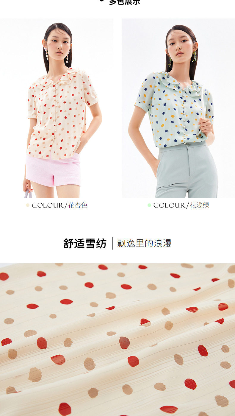 首页 > 玖姿专区 > 玖姿服饰 > 玖姿2021夏季新款安娜蔻系列彩色波点清新凉爽翻领女短袖雪纺衫