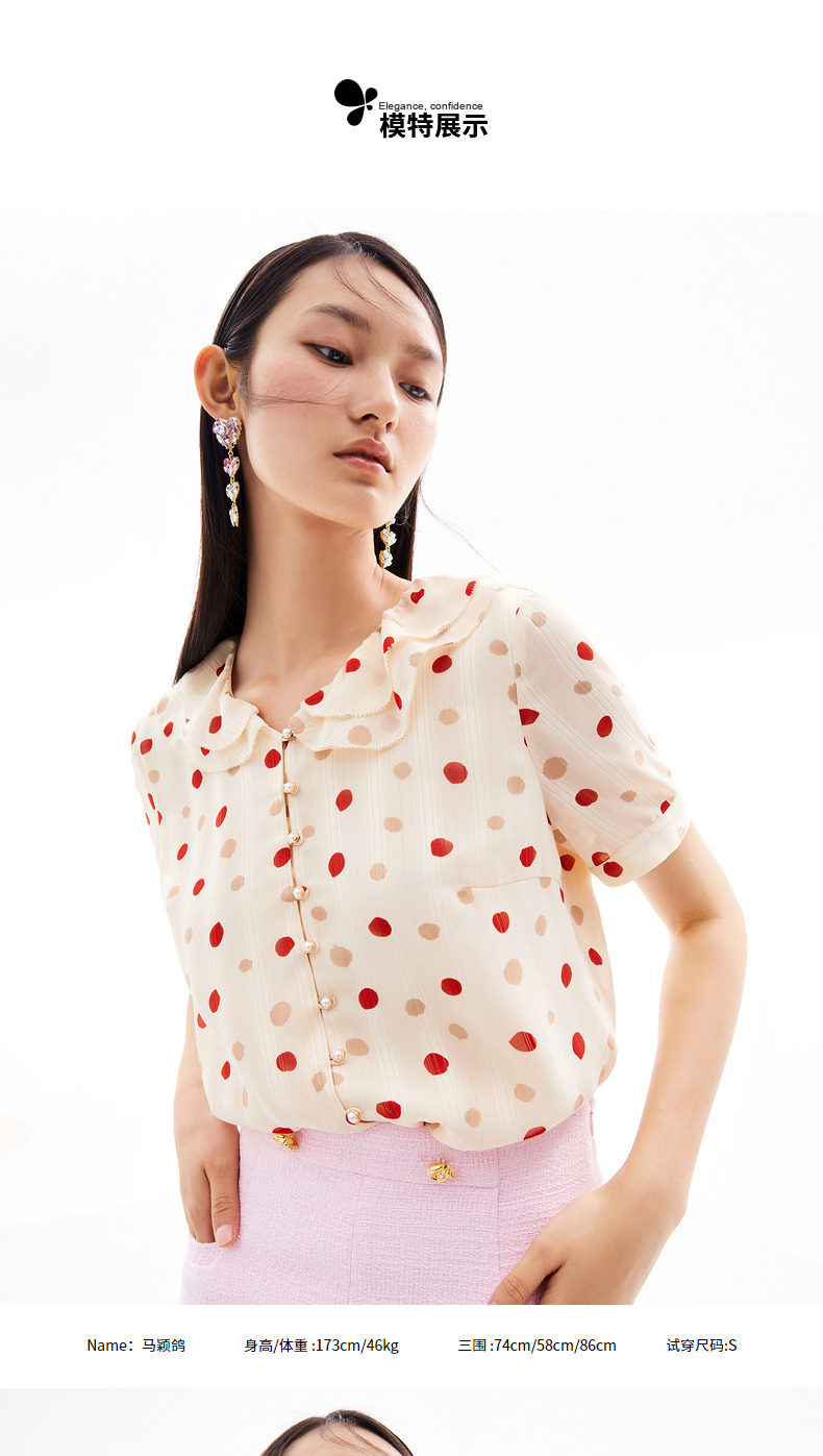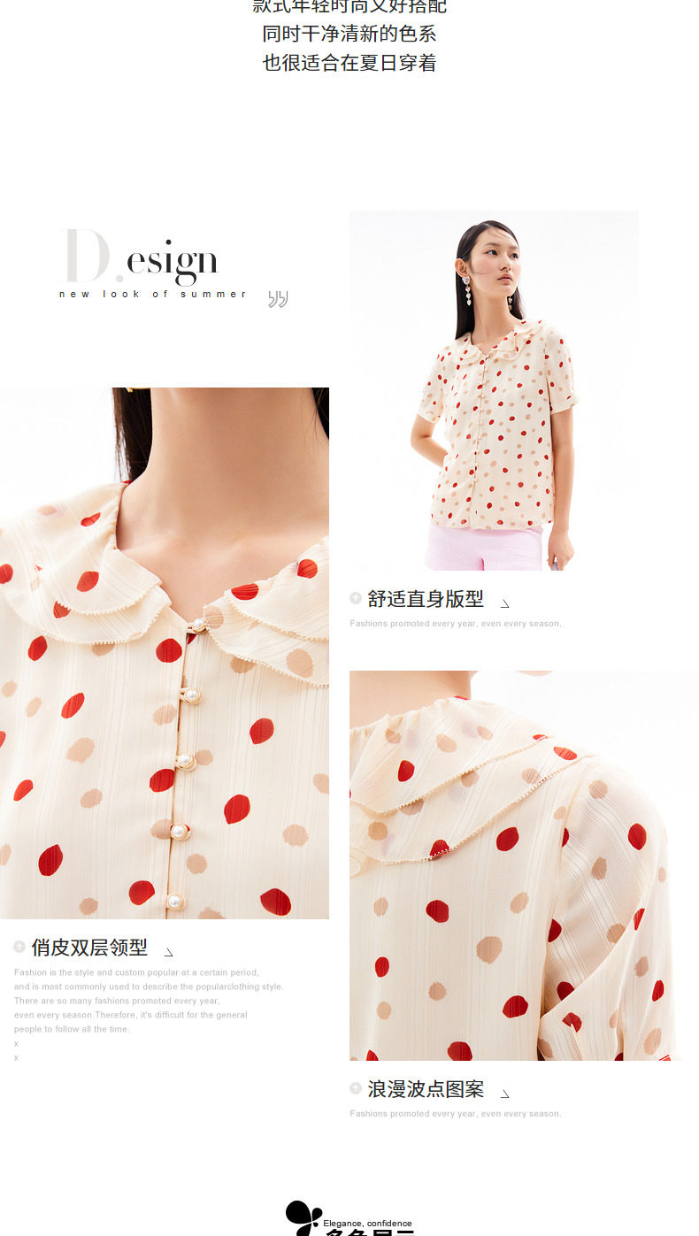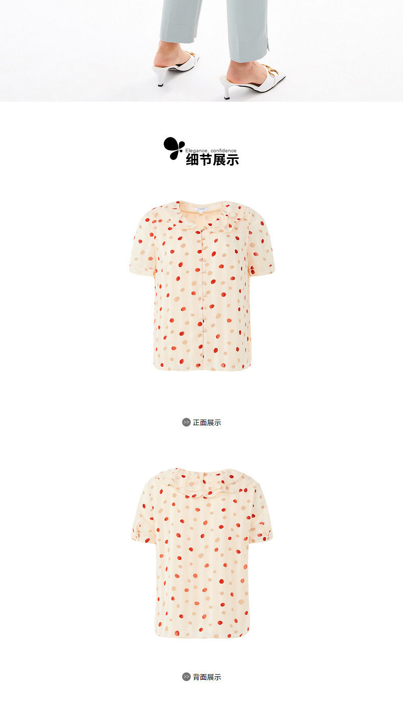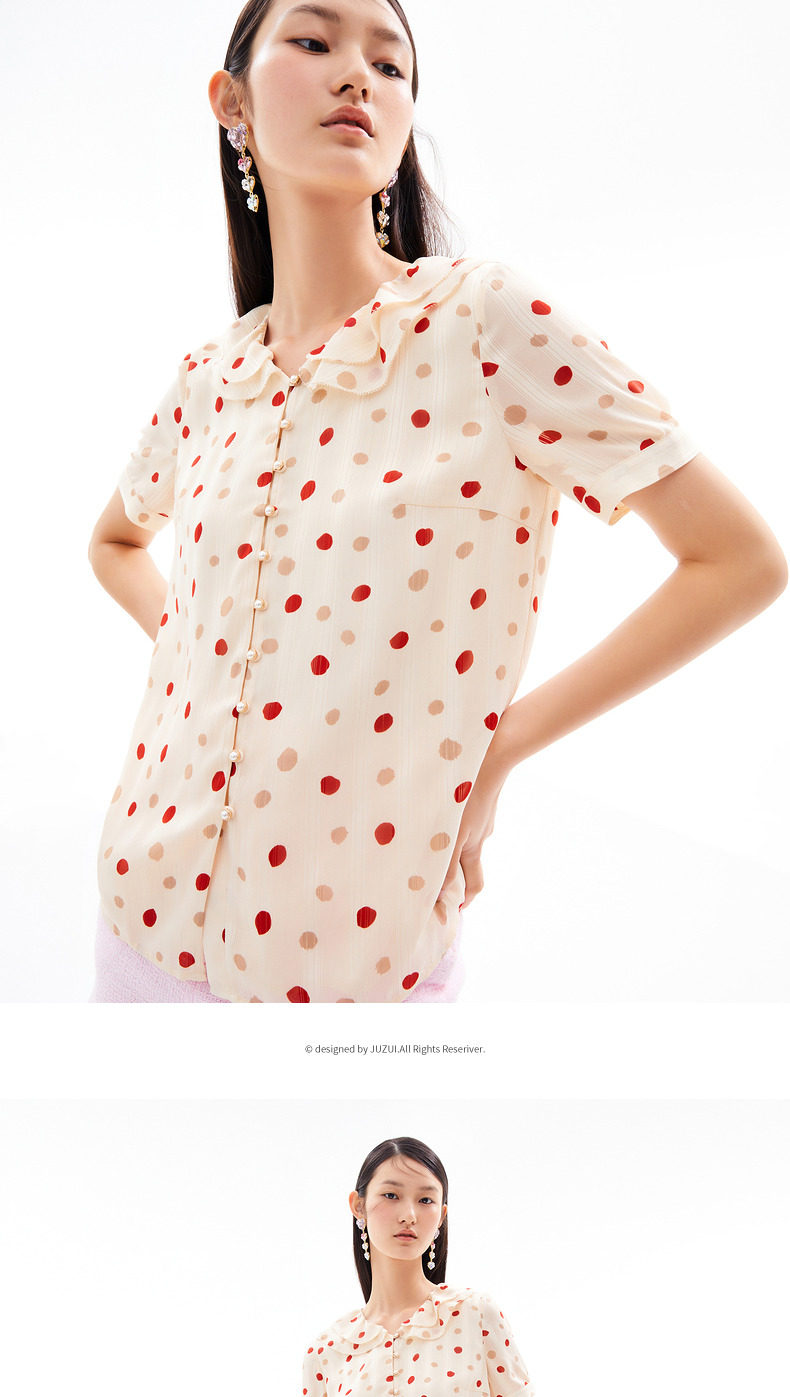 首页 > 玖姿专区 > 玖姿服饰 > 玖姿2021夏季新款安娜蔻系列彩色波点清新凉爽翻领女短袖雪纺衫