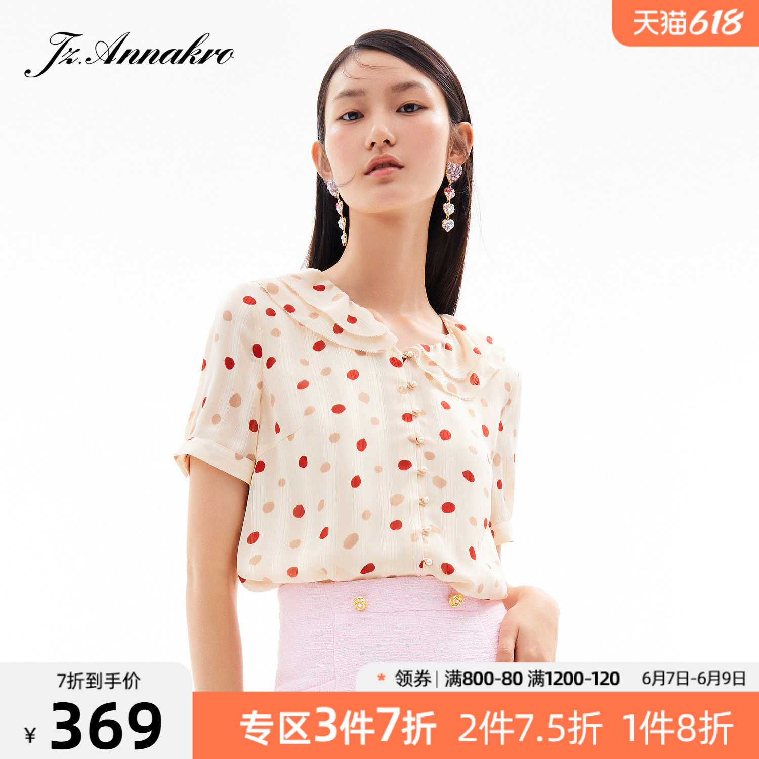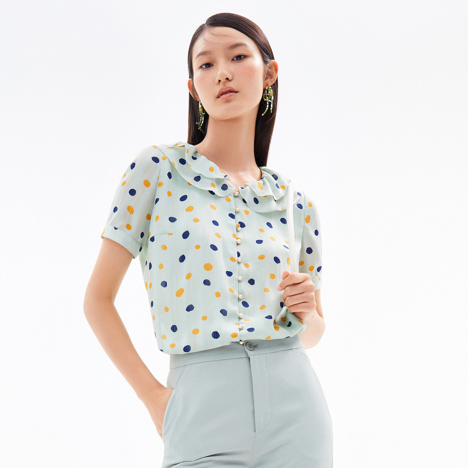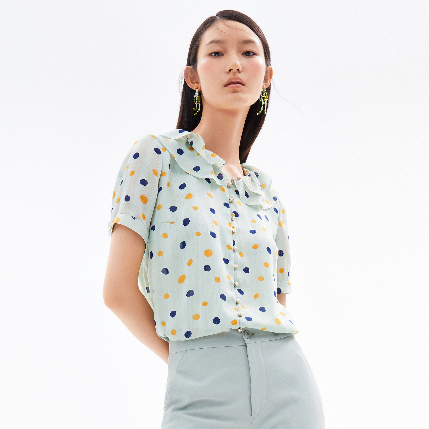 玖姿2021夏季新款安娜蔻系列彩色波点清新凉爽翻领女短袖雪纺衫