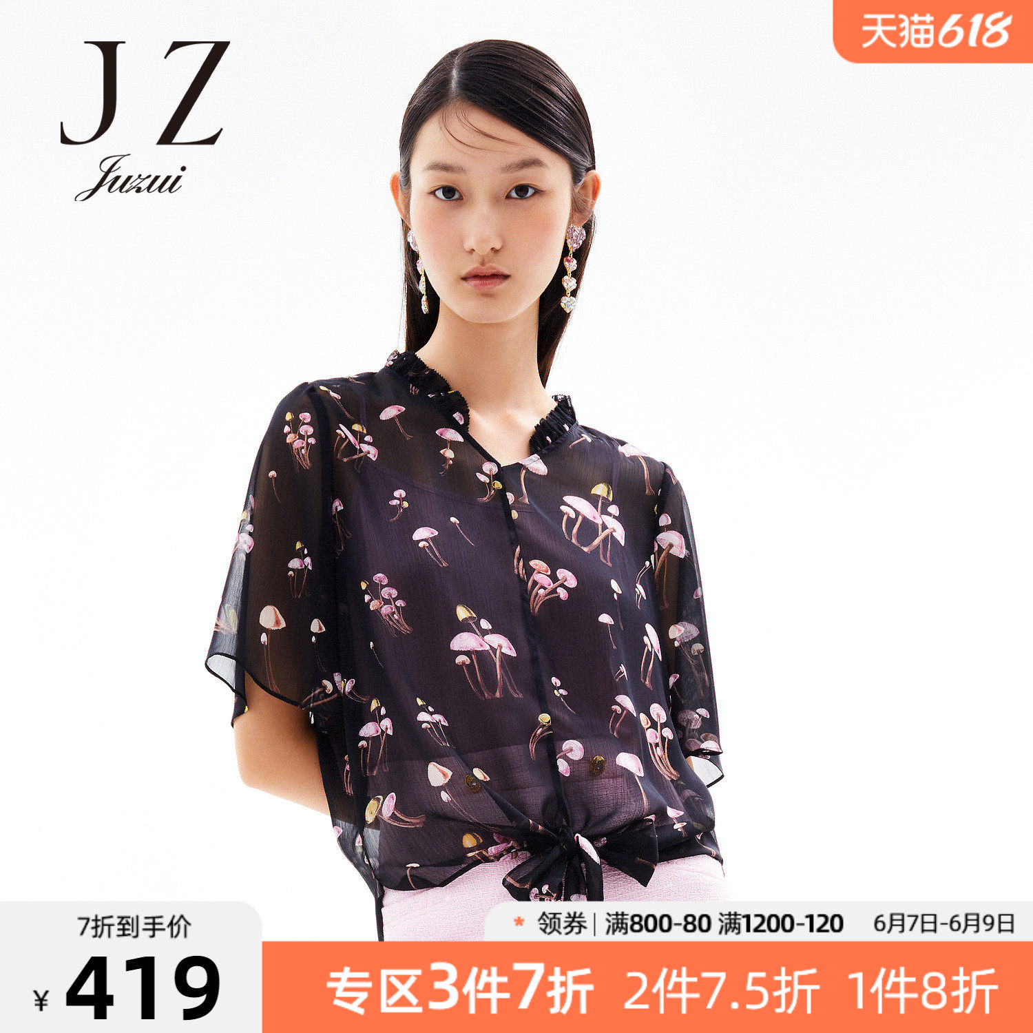 JUZUI/玖姿官方旗舰店2021夏季新款黑色趣味印花轻盈打结女雪纺衫