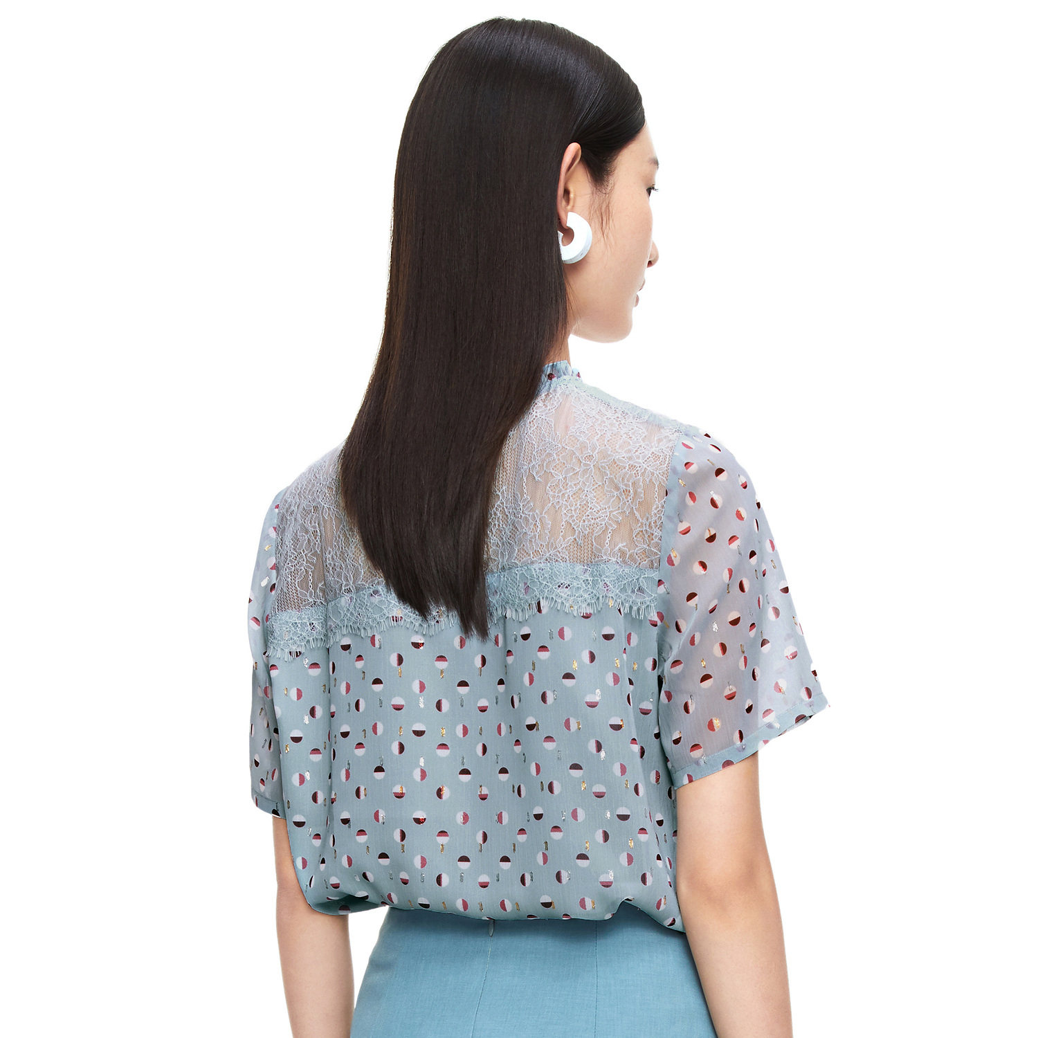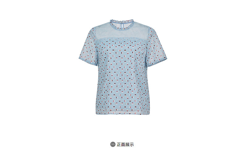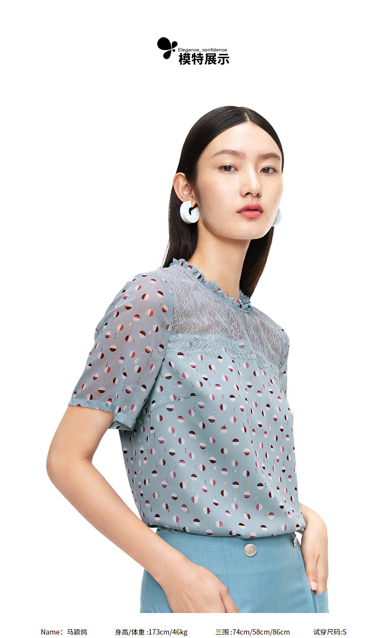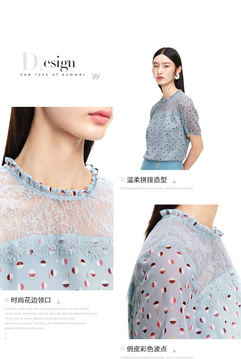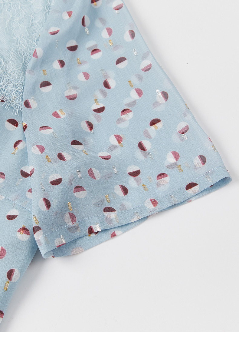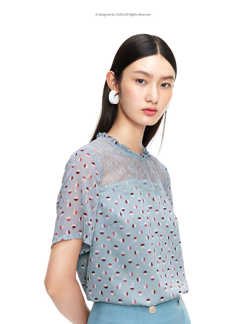 首页 > 玖姿专区 > 玖姿服饰 > 玖姿2021夏季新款安娜蔻系列浅蓝色蕾丝拼接时尚波点提花女雪纺衫