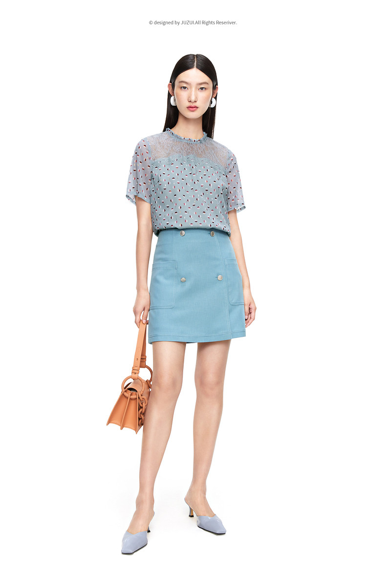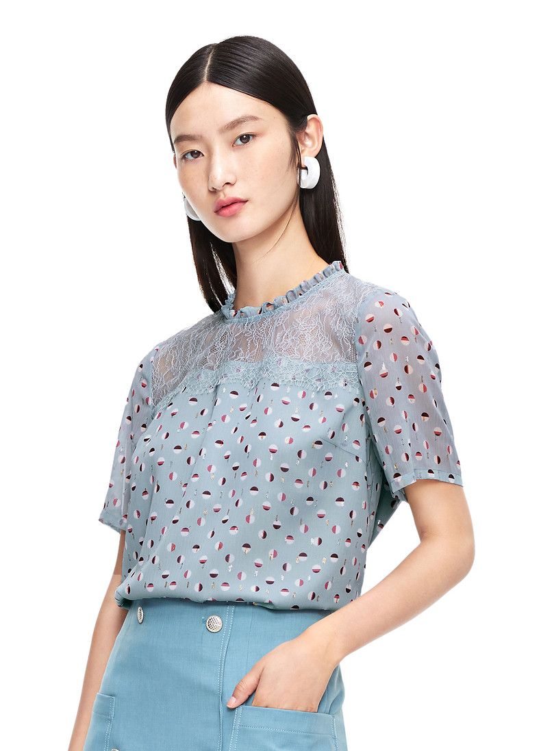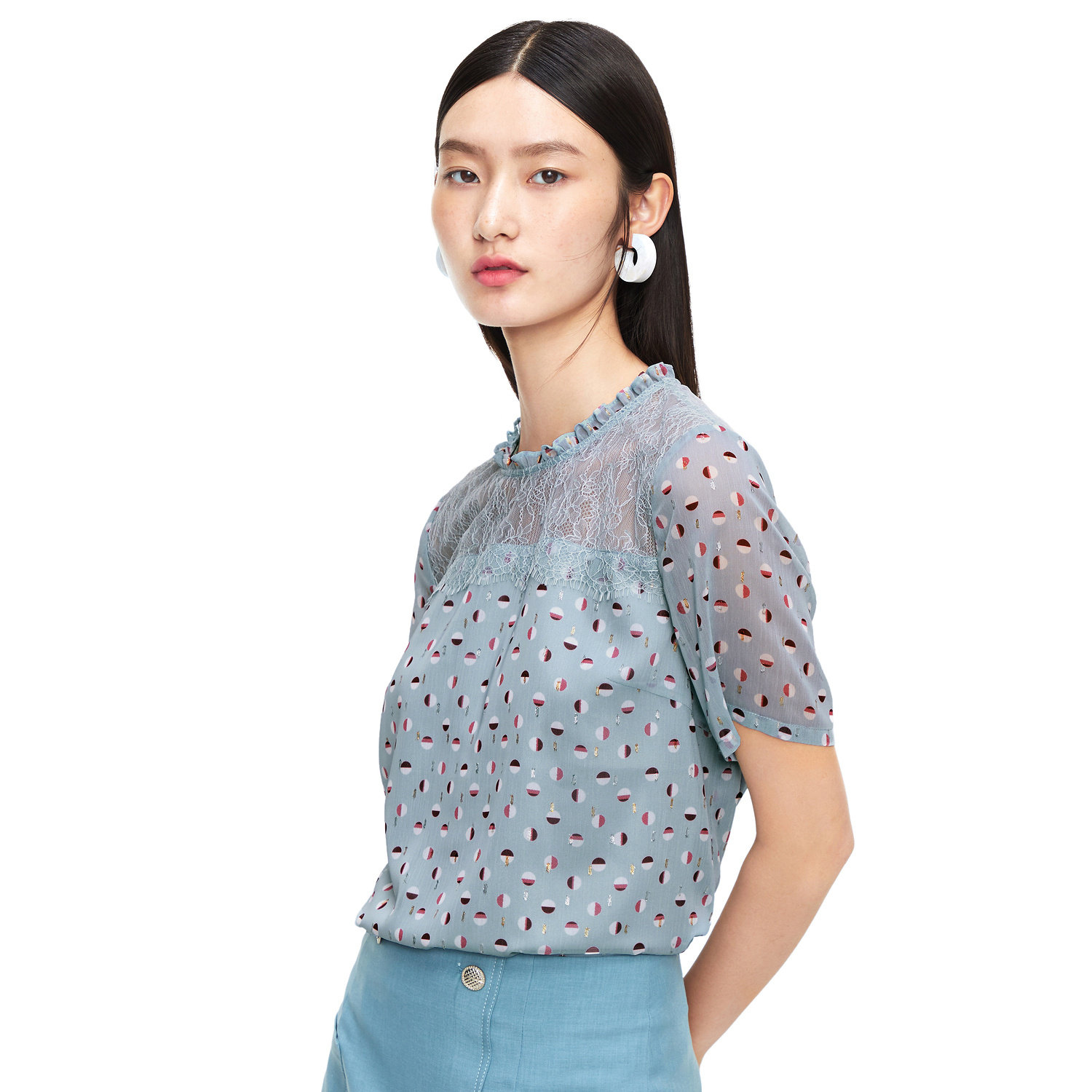 玖姿2021夏季新款安娜蔻系列浅蓝色蕾丝拼接时尚波点提花女雪纺衫