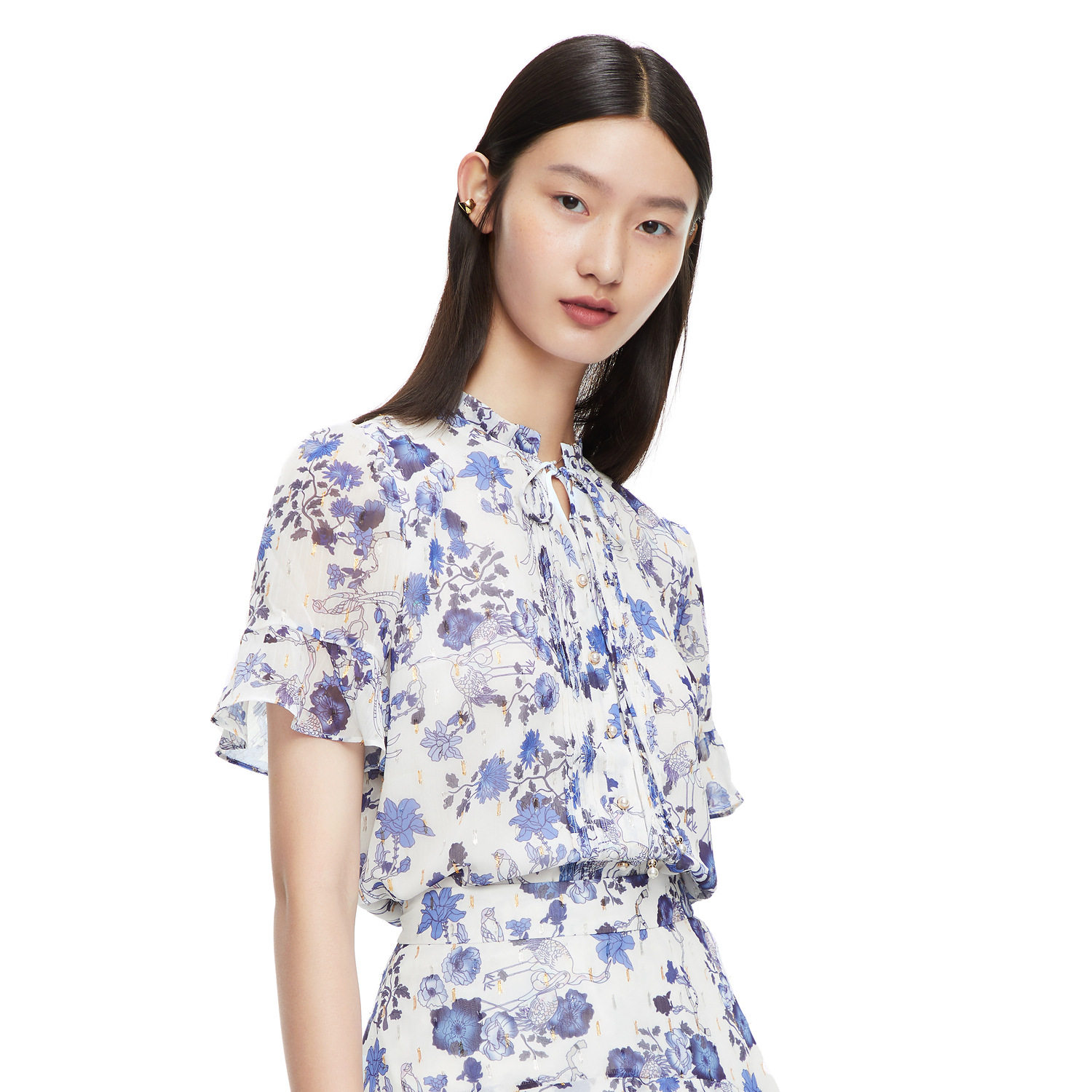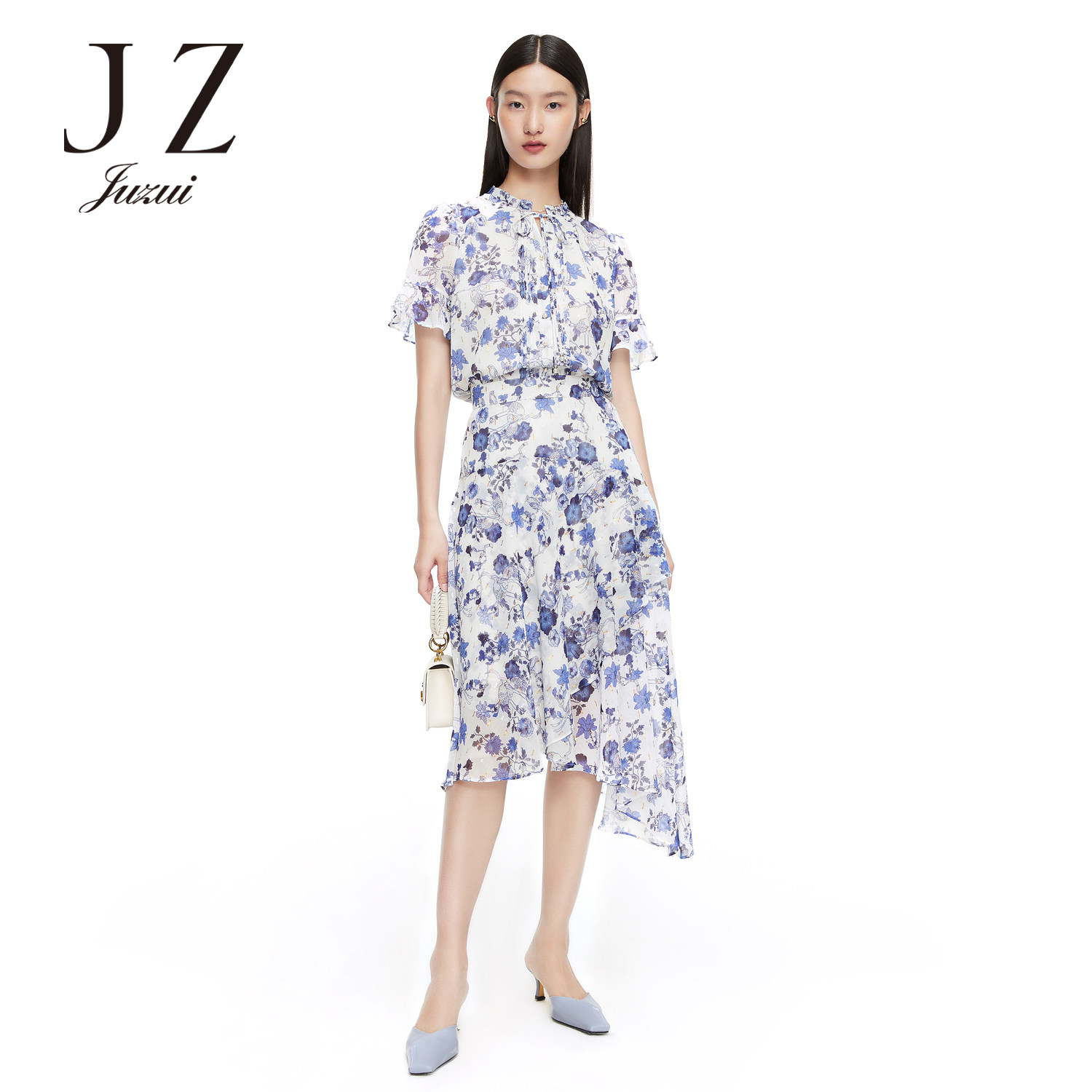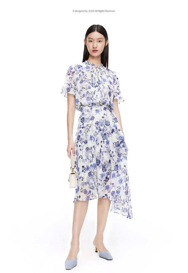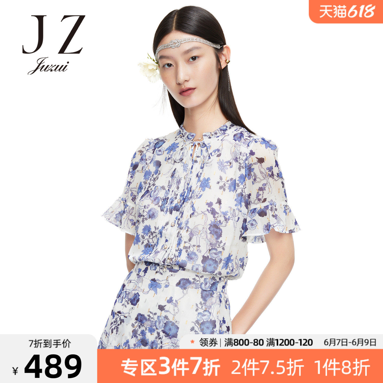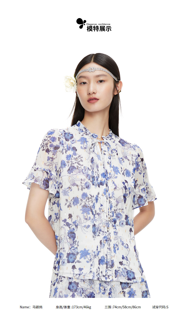 JUZUI/玖姿官方旗舰店2021夏季新款紫色系带印花优雅女雪纺衬衫