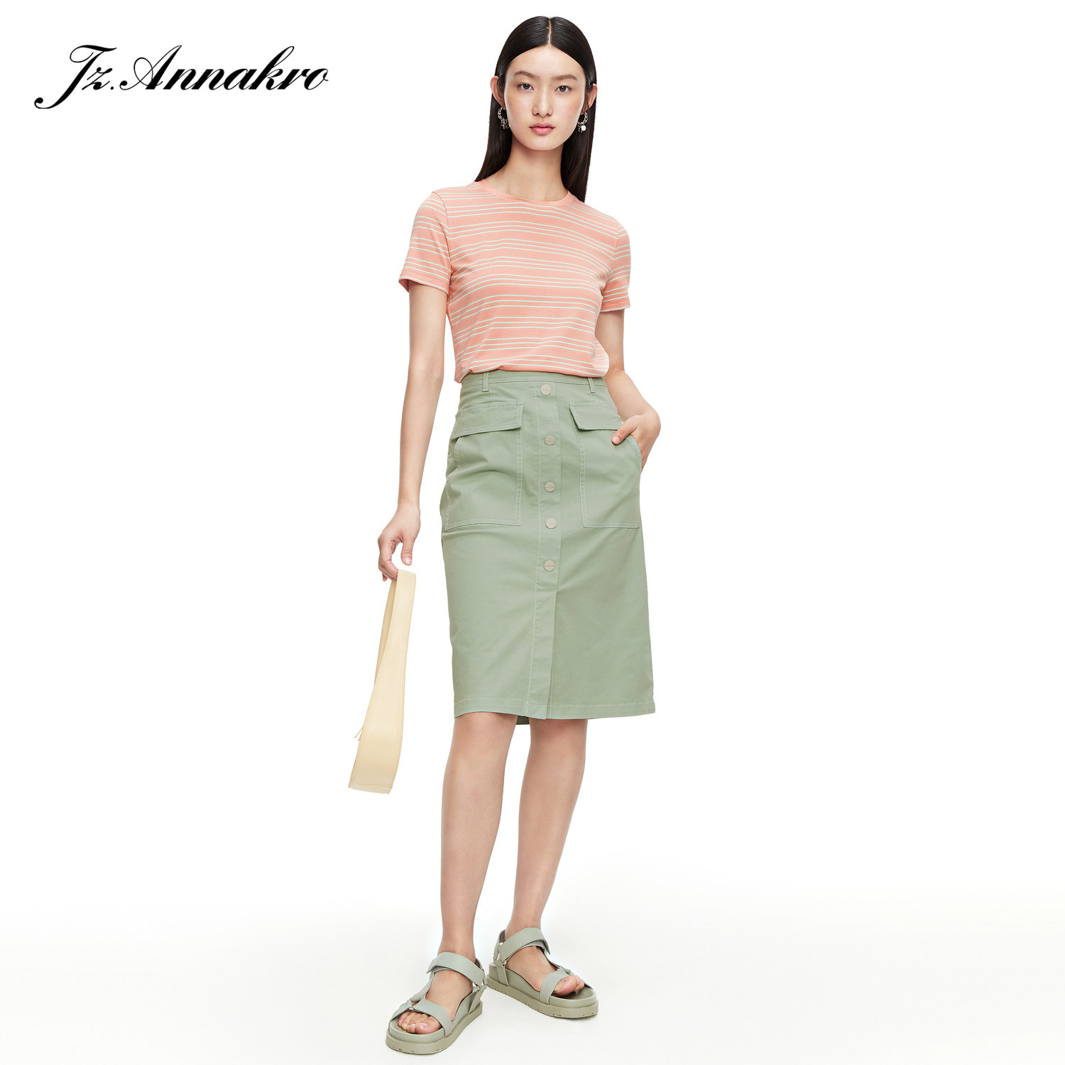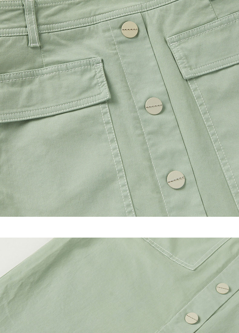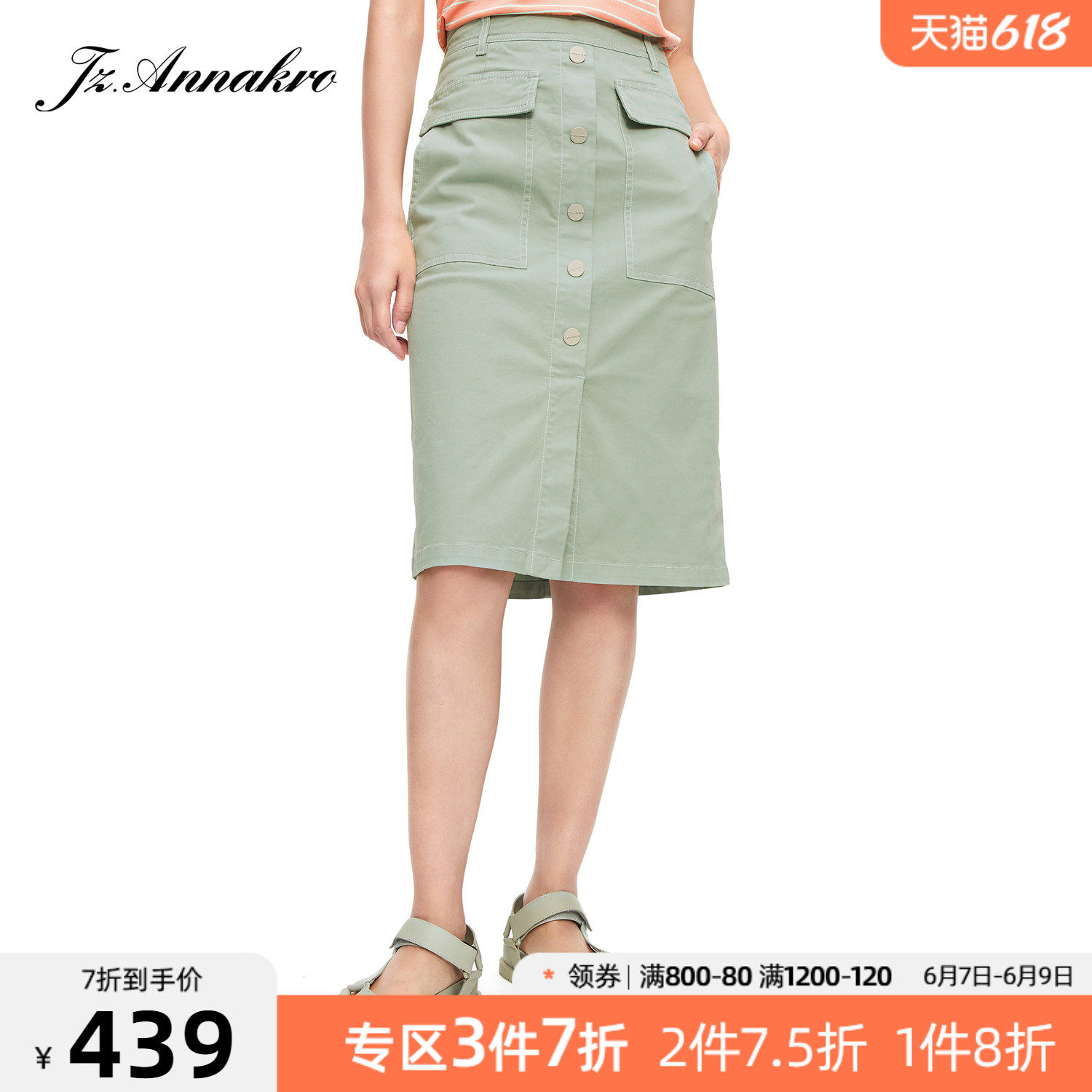 玖姿2021夏季新款安娜蔻系列薄荷绿一排扣直身时尚女牛仔半身裙