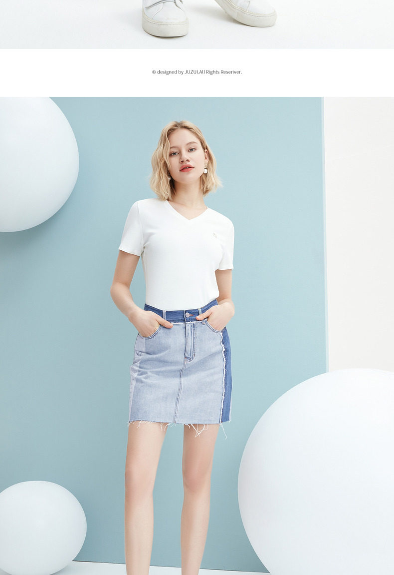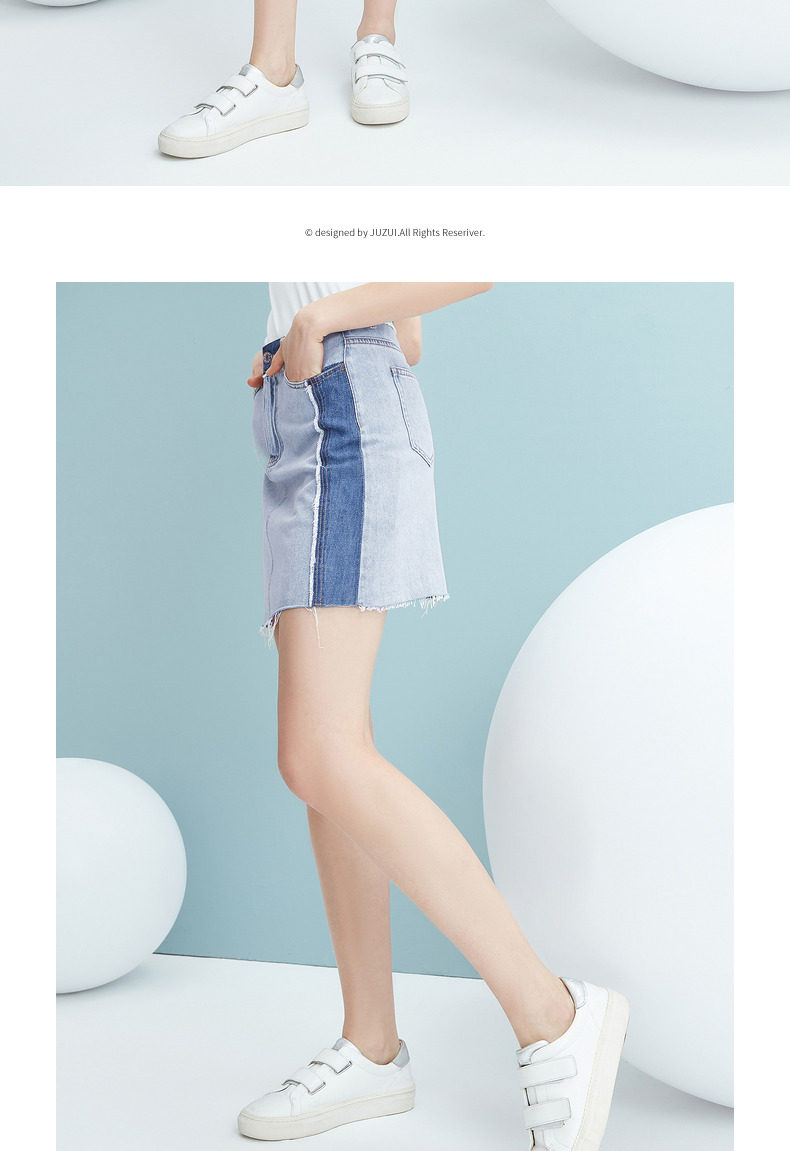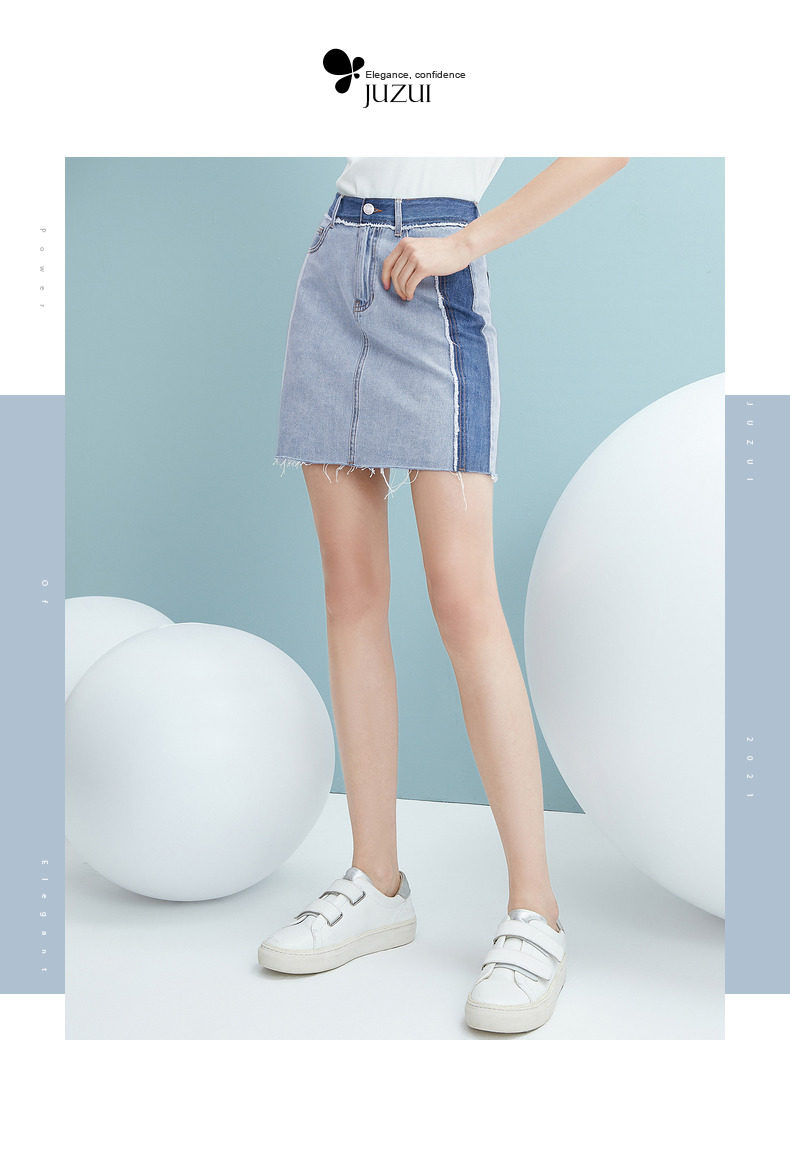 JUZUI/玖姿官方旗舰店2021夏季新款蓝色青春拼接A字摆女牛仔半裙