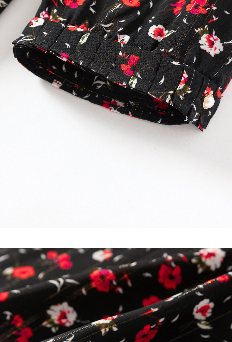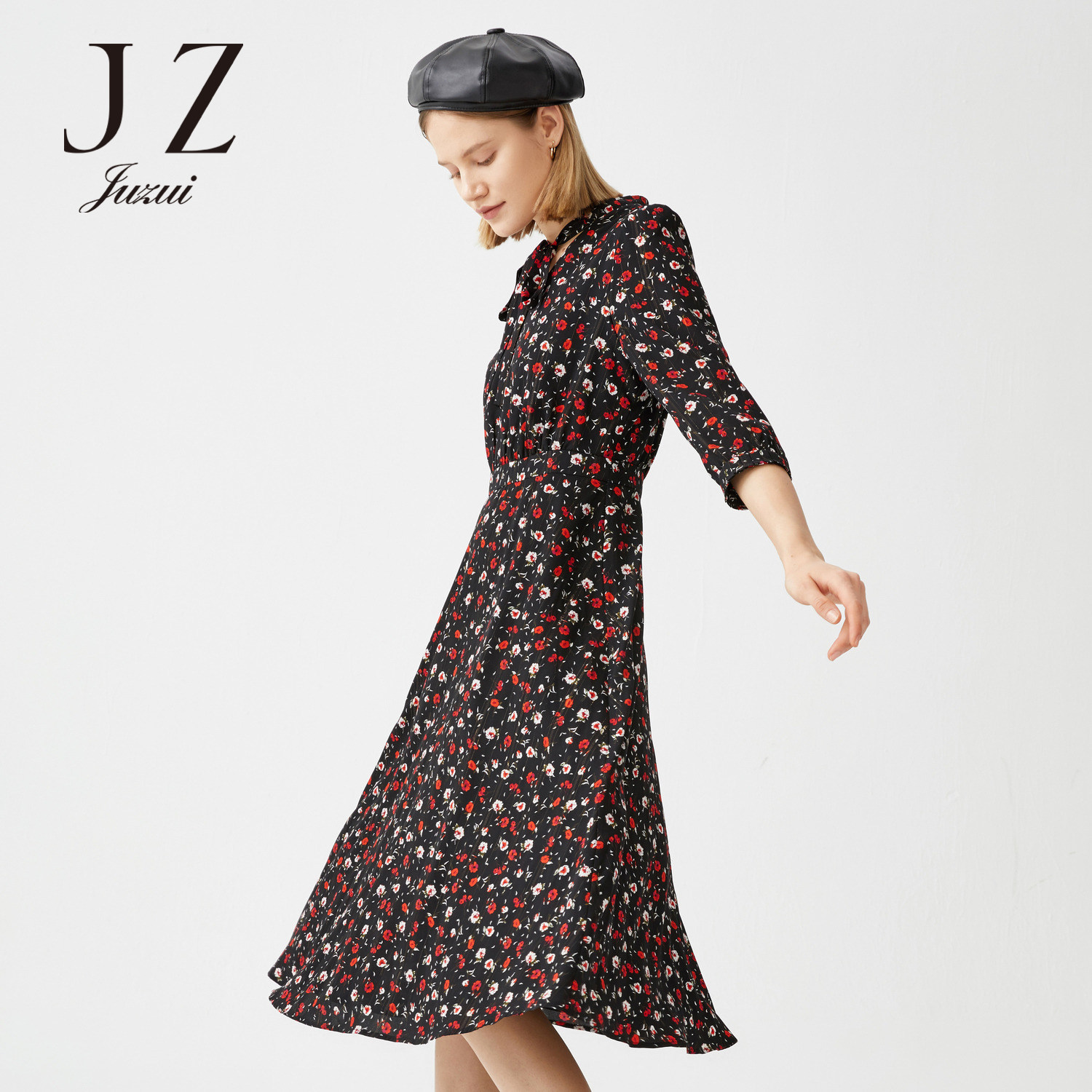 JUZUI/玖姿官方旗舰店2021春季新款优雅碎花收腰长款雪纺女连衣裙