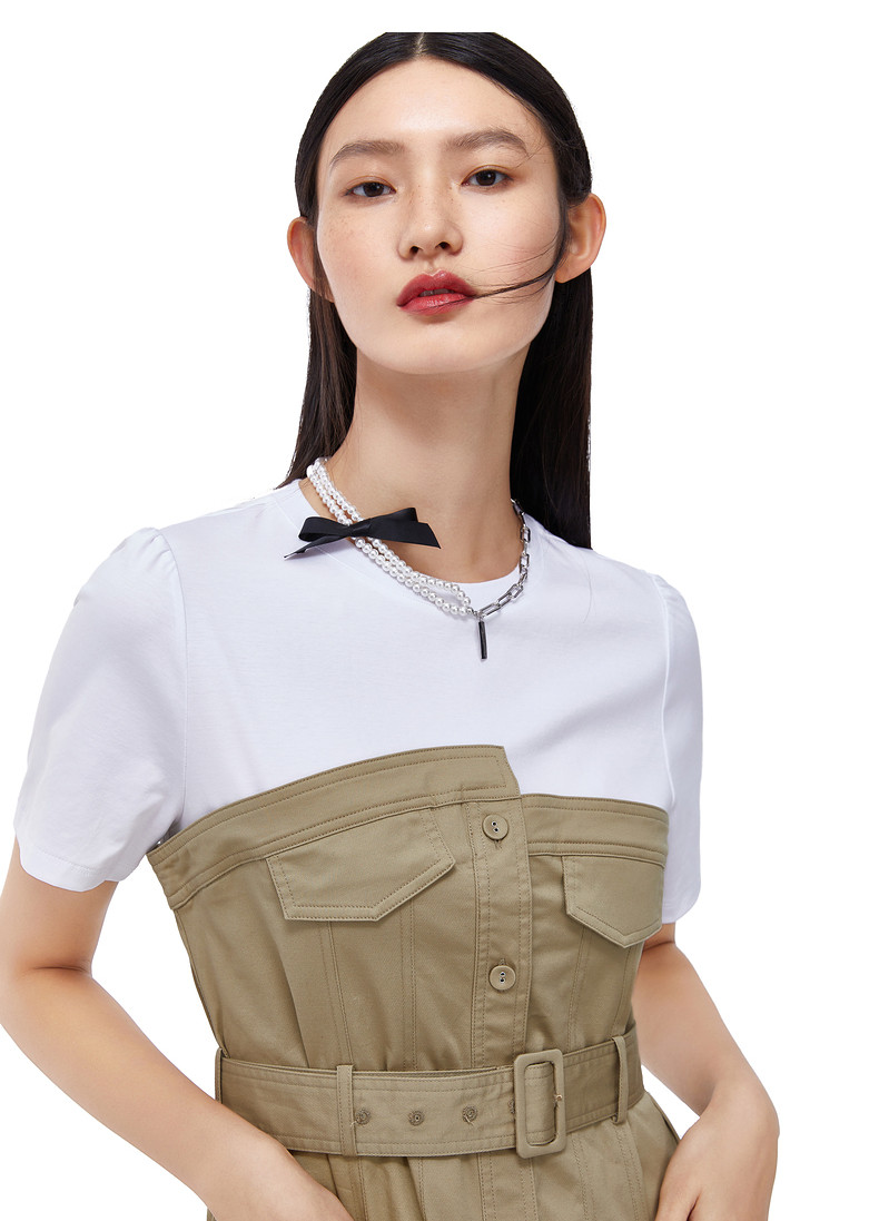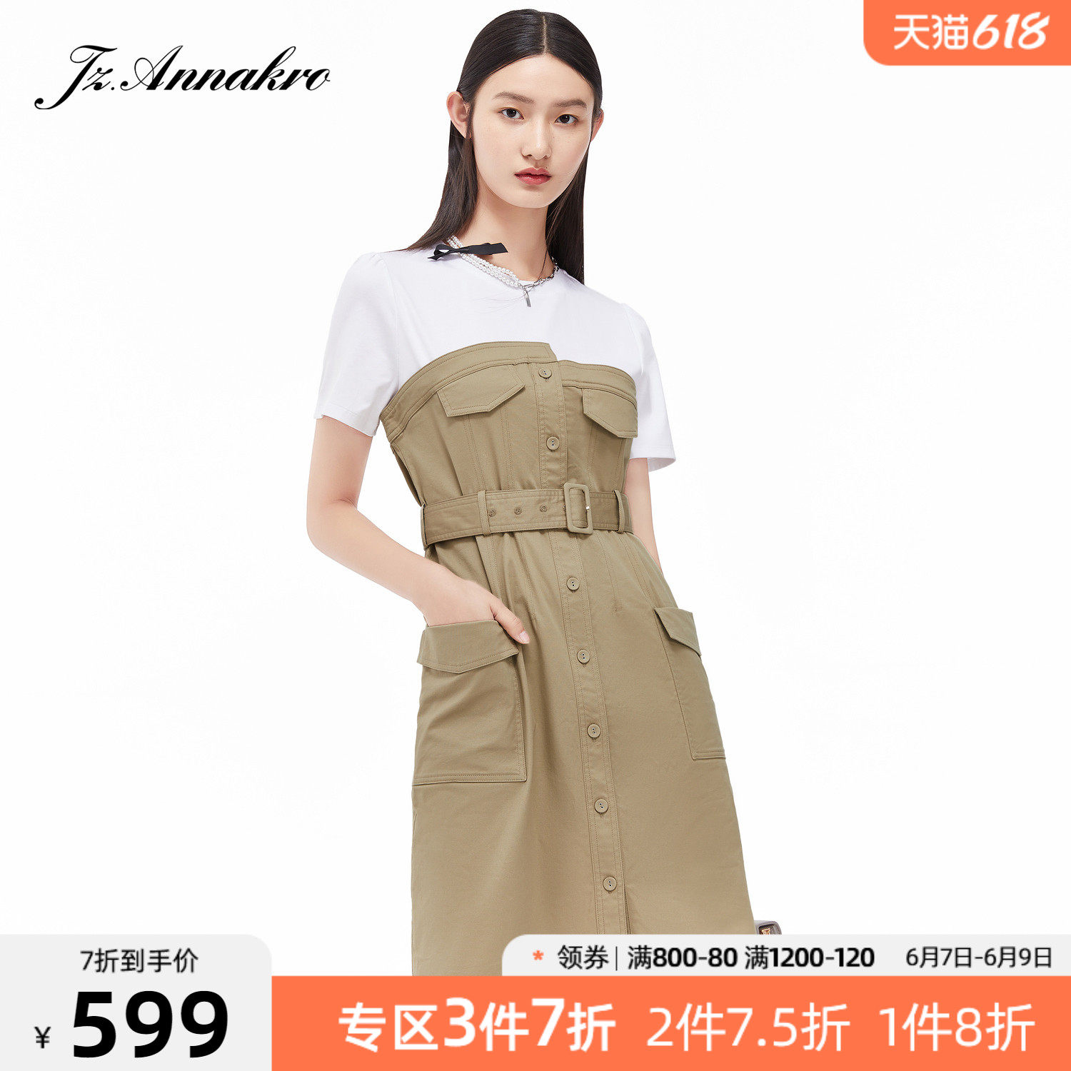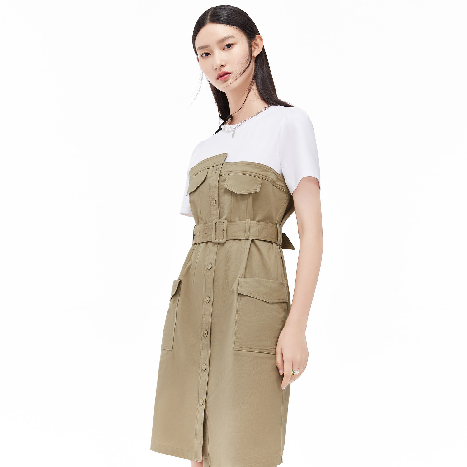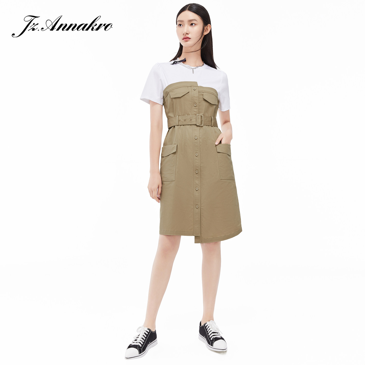 首页 > 玖姿专区 > 玖姿服饰 > 玖姿2021夏季新款安娜蔻系列卡其色工装风时尚拼接收腰女连衣裙