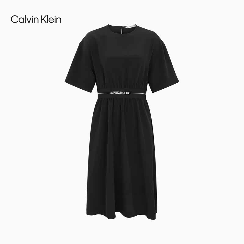 CK Jeans 2021春夏新款女装圆领后纽扣LOGO织带腰边连衣裙J217975